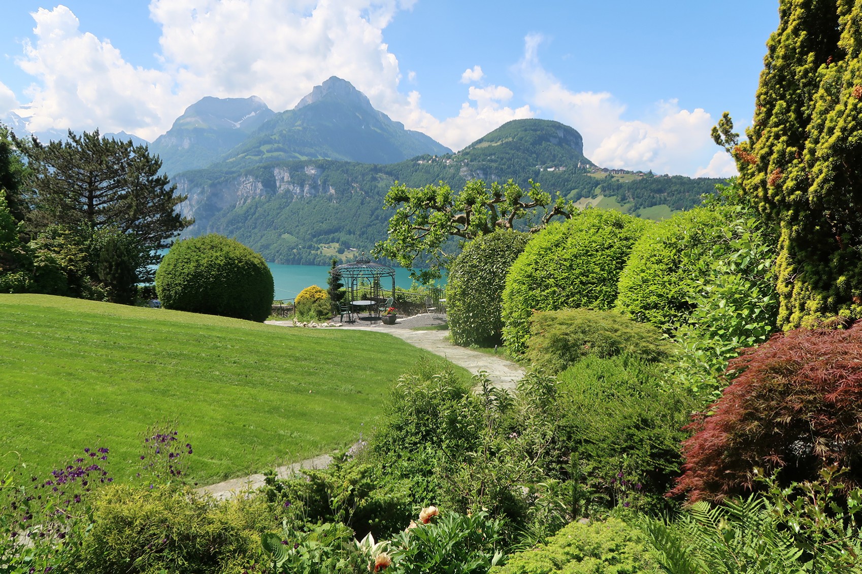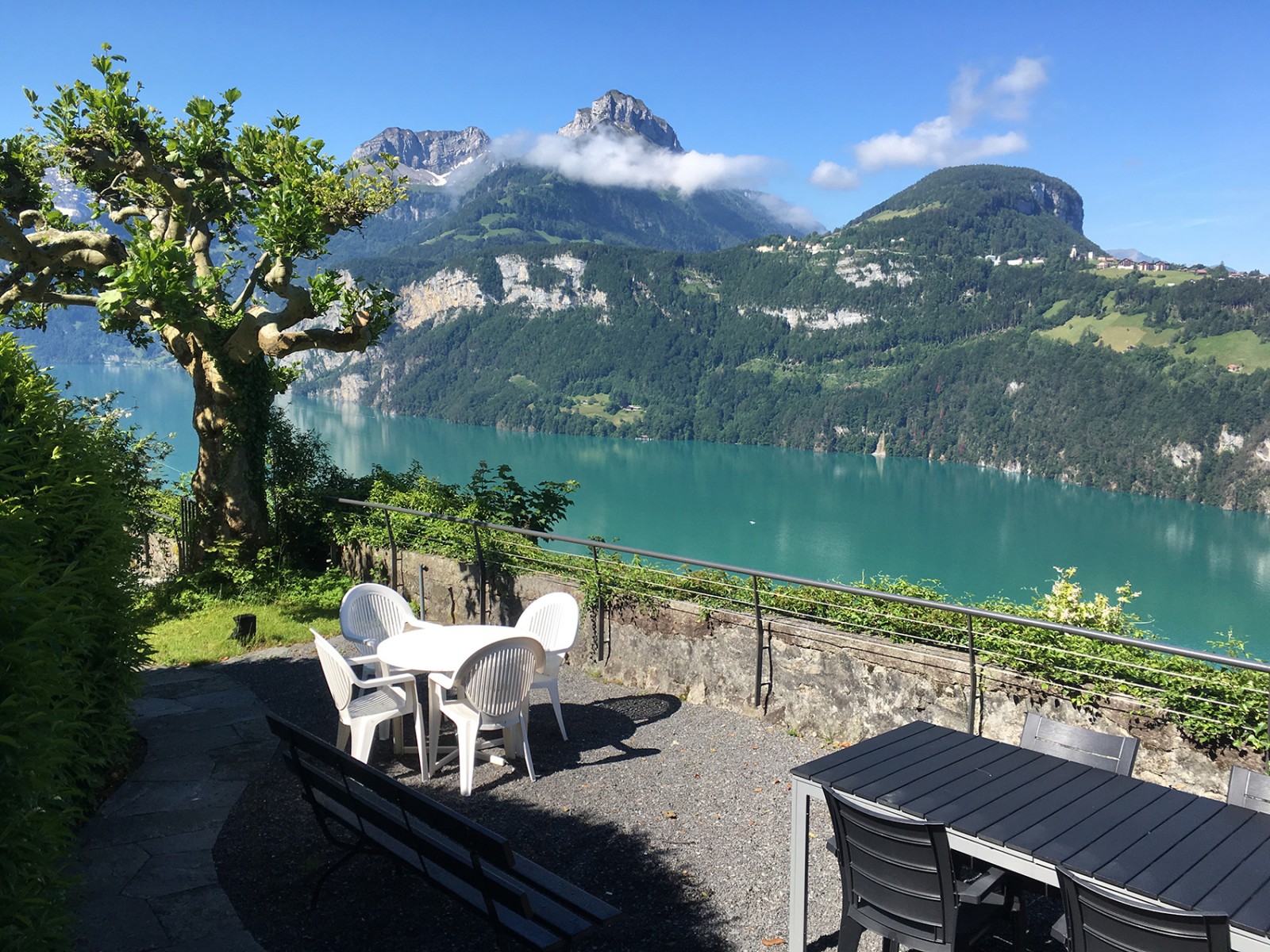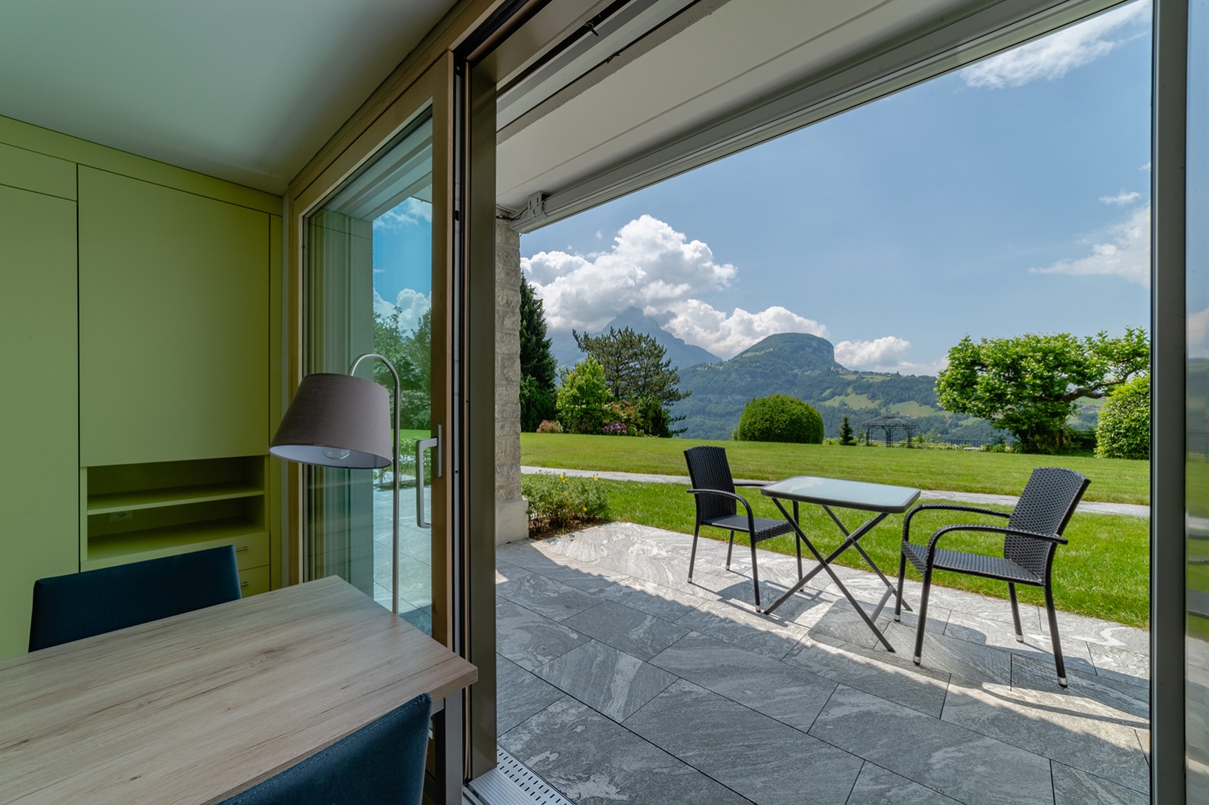 Im Gartengeschoss mit direktem Zugang zum Garten und mit Blick auf die umliegenden Berge befindet sich diese komfortable Studiowohnung. Die gediegene Ausstattung und die elegante Farbgebung sowie die grosse Fensterfront betonen die Originalität dieser Wohneinheiten. Die Einzigartigkeit dieser Wohnungen wird unterstützt durch den eigenen Sitzplatz mit direktem Zugang zur Gartenanlage und zur Aussichtsplattform mit grandioser Sicht auf den See und die Berge.