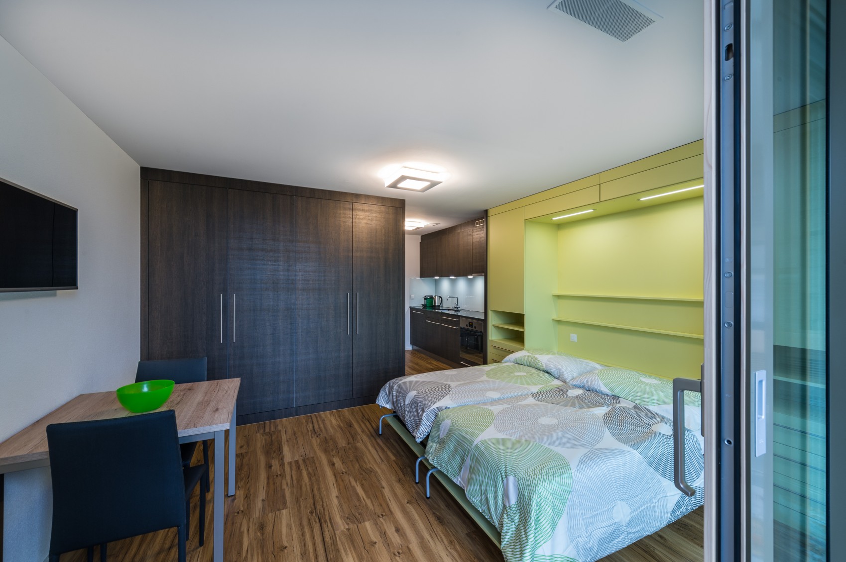 Diese Wohneinheit liegt im Untergeschoss auf der Gartenebene und ist über eine bequeme Treppe oder den Lift erreichbar. Die platzsparenden Schrankbetten können in zwei bequeme Einzelbetten umgewandelt werden. Bei hochgeklappter Version entsteht ein eleganter Wohnraum, in welchem sowohl ein Esstisch wie auch zwei Sessel Platz finden. Der grosszügige WC/Dusch-Bereich sowie die Küchenzeile verleihen diesem Studio die Eigenschaft einer kompletten Wohneinheit.