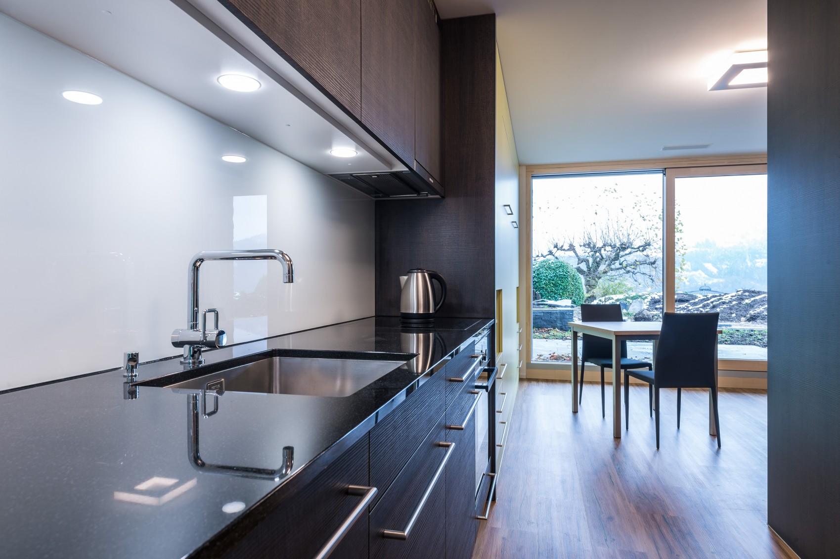 Die elegante Küchenzeile mit dunklen Kunstharzoberflächen und Steinabdeckung verfügt über einen Glaskeramikherd mit vier Kochfeldern mit Dampfabzug, einen Backofen sowie über einen Kühlschrank mit Eisfach. Ein Mikrowellengerät, Kaffeemaschine, Wasserkocher, Toaster sowie genügend Koch- und Essgeschirr gehören ebenso zur Grundausstattung.