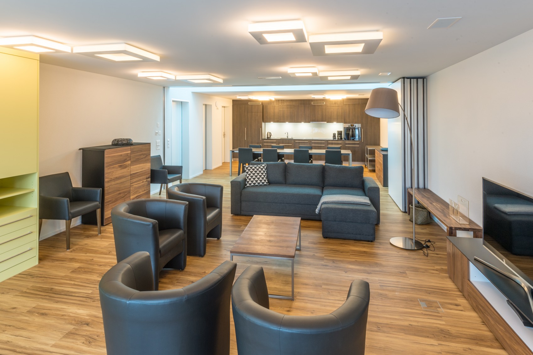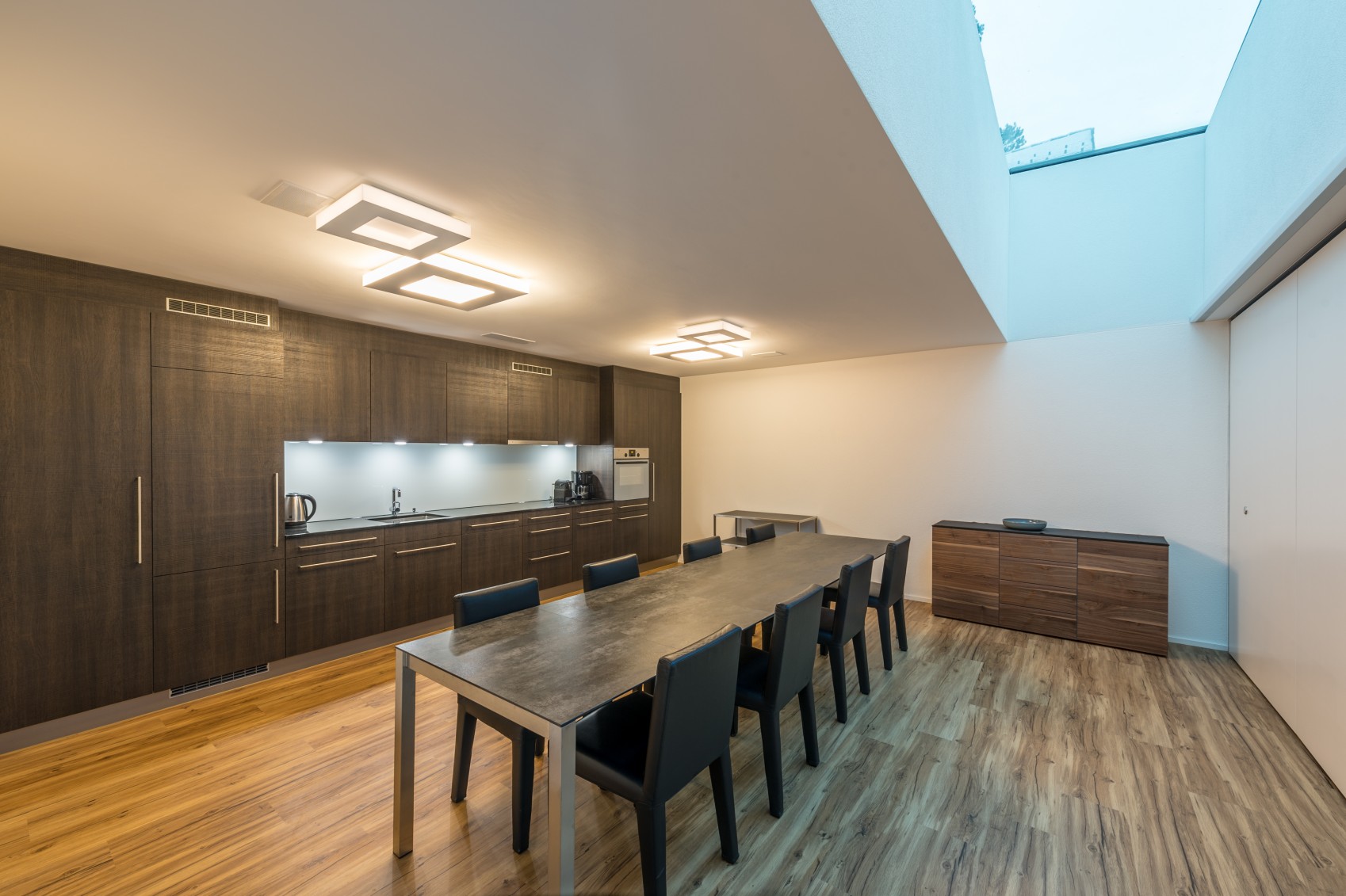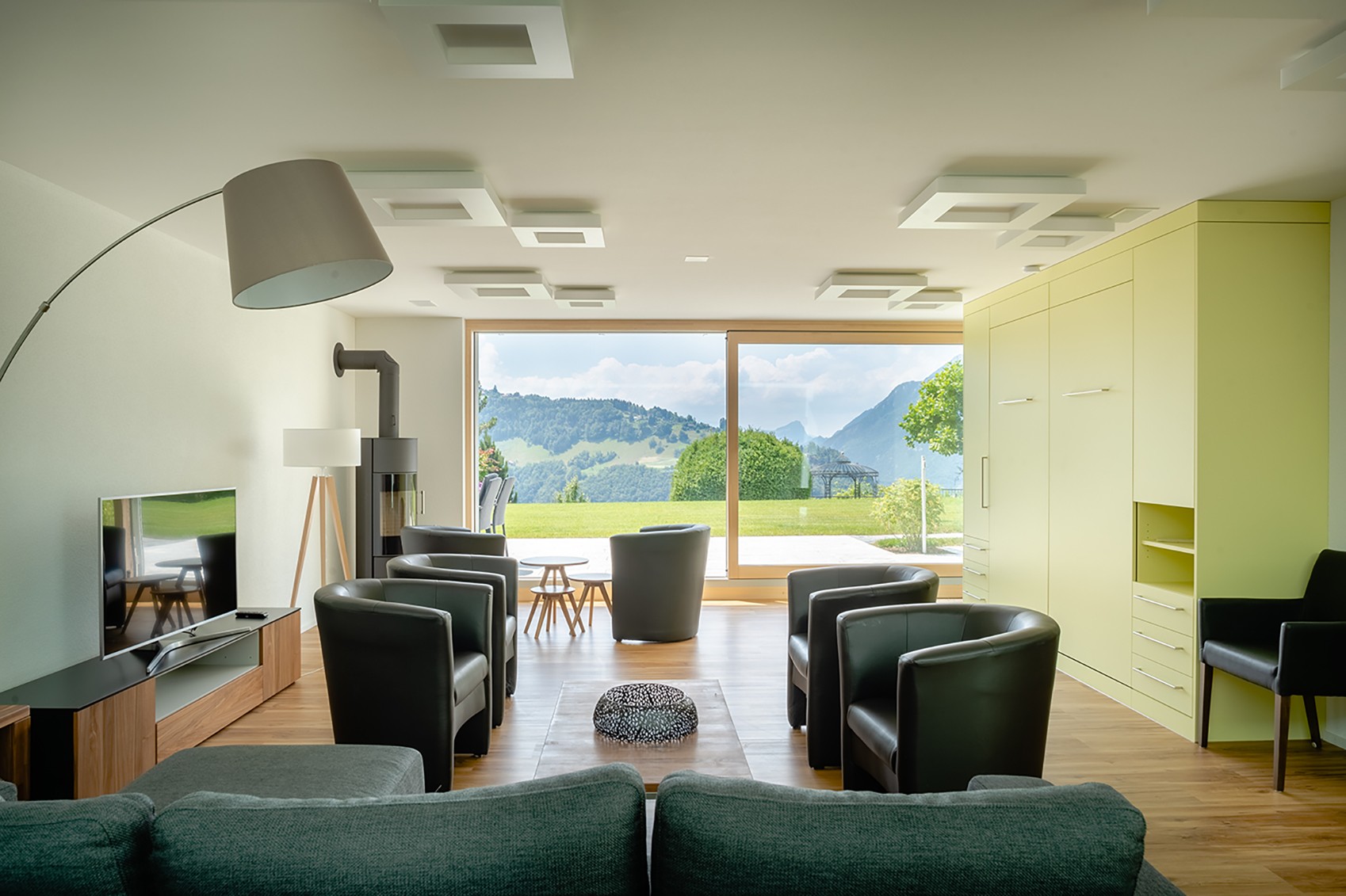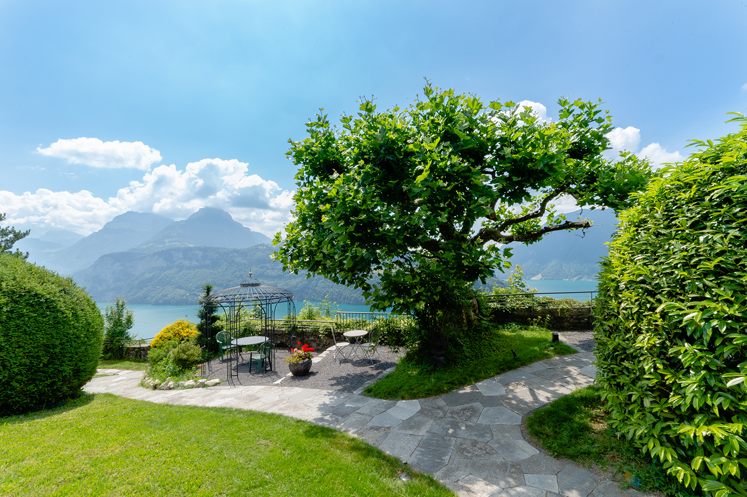 Diese grosszügige und komfortable 3-Zimmer-Wohnung liegt ebenerdig zum grossen Garten hin. Allein das Wohnzimmer erstreckt sich über 50 m2 und kann mittels einer Schiebetüre zum Koch- und Essbereich hin noch um 20 m2 vergrössert werden. Die zuschaltbaren Schlafzimmer verfügen über einen eigenen WC/DU-Raum und eine Küchenzeile. Über den grossen Aussensitzplatz erreicht man den Garten und die beiden Aussichtskanzeln mit einmaligem Blick auf den See und die Berge. Ein eleganter Holzofen sorgt für eine behagliche Atmosphäre. Diese Wohnung kann individuell als Ein-, Zwei- oder Dreizimmerwohnung gemietet werden.