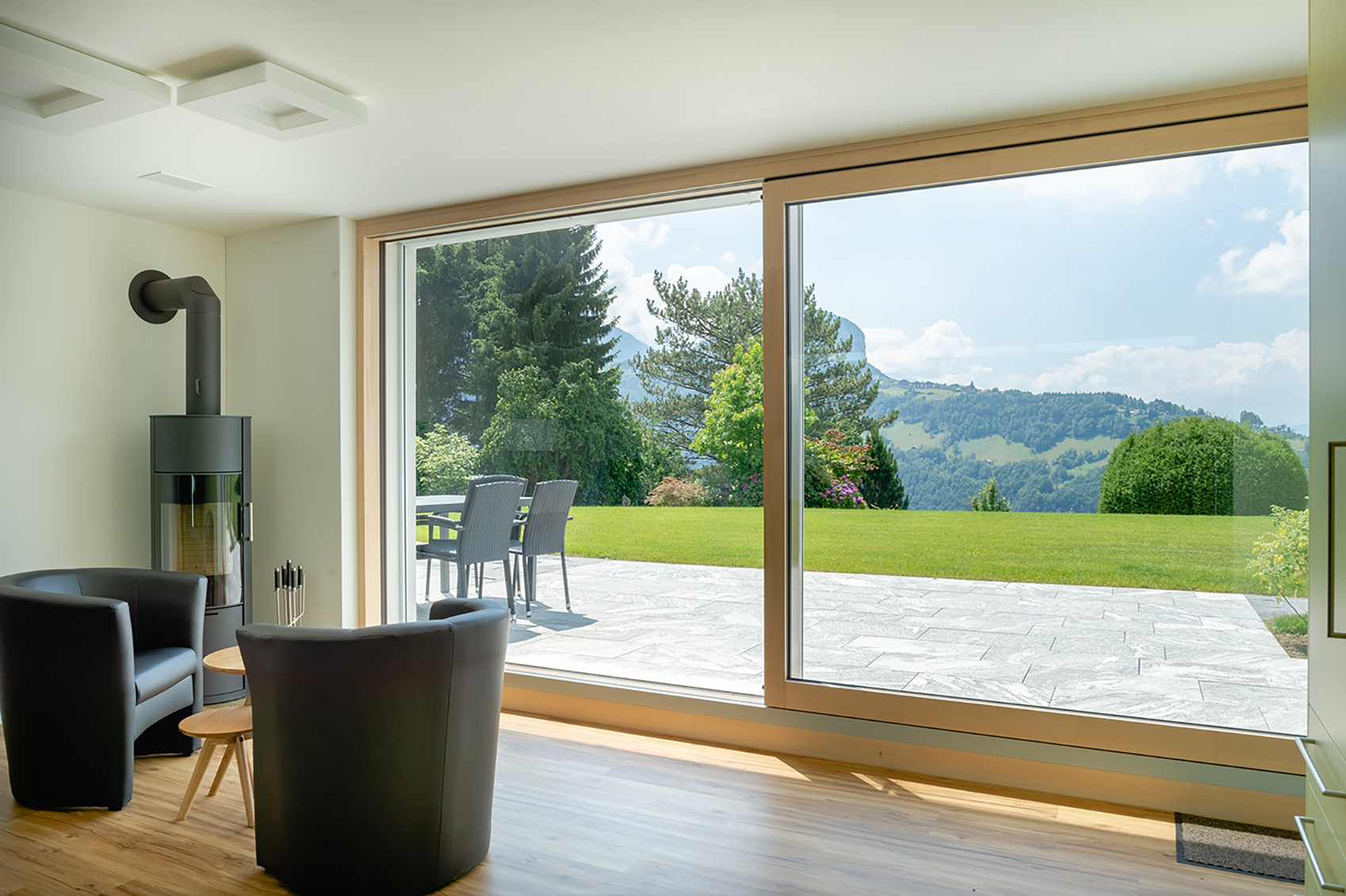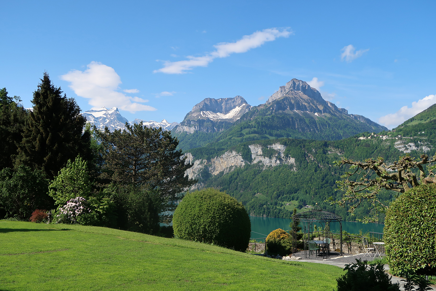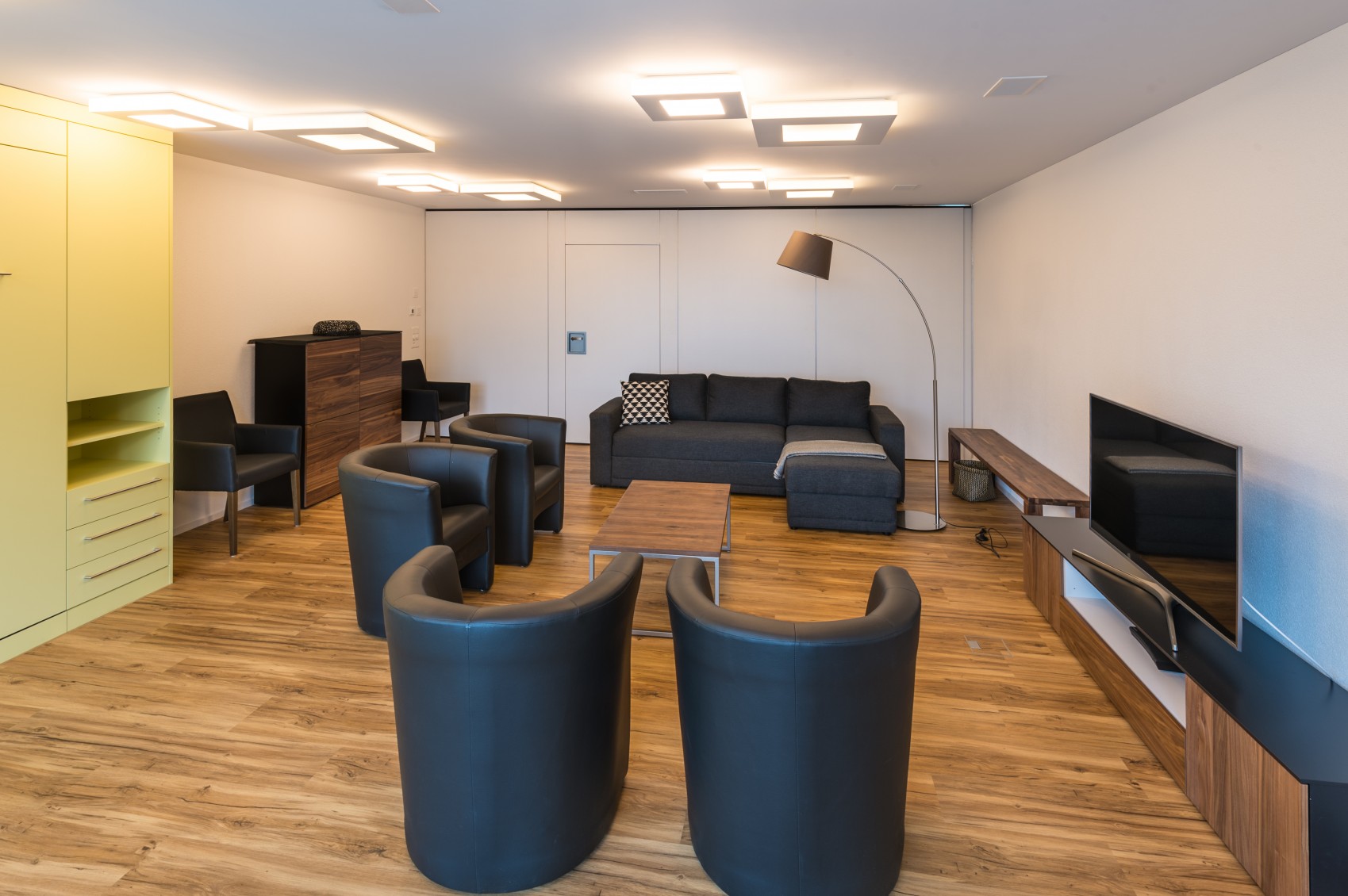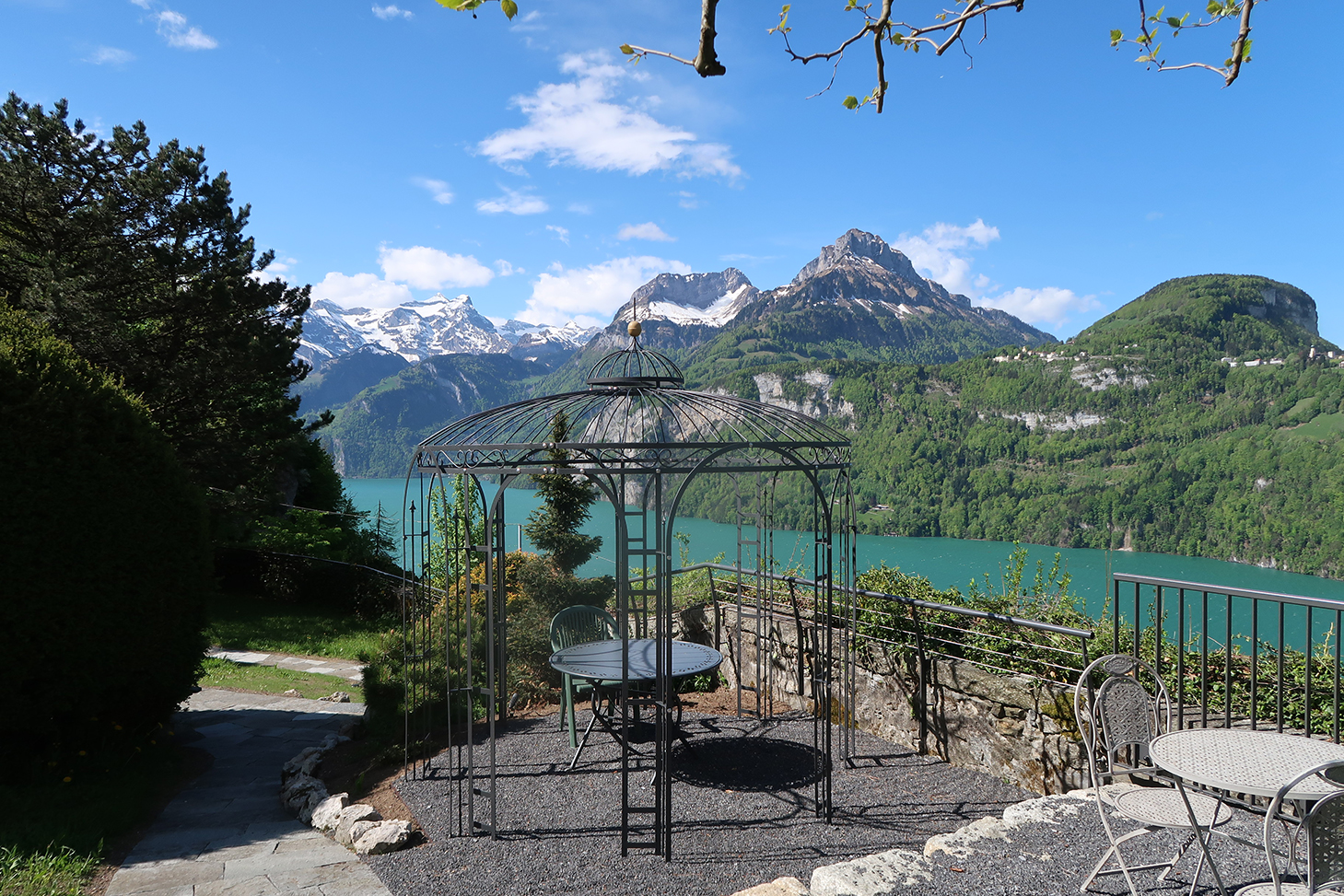Diese grosszügige und komfortable 3-Zimmer-Wohnung liegt ebenerdig zum grossen Garten hin. Allein das Wohnzimmer erstreckt sich über 50 m2 und kann mittels einer Schiebetüre zum Koch- und Essbereich hin noch um 20 m2 vergrössert werden. Die zuschaltbaren Schlafzimmer verfügen über einen eigenen WC/DU-Raum und eine Küchenzeile. Über den grossen Aussensitzplatz erreicht man den Garten und die beiden Aussichtskanzeln mit einmaligem Blick auf den See und die Berge. Ein eleganter Holzofen sorgt für eine behagliche Atmosphäre. Diese Wohnung kann individuell als Ein-, Zwei- oder Dreizimmerwohnung gemietet werden.