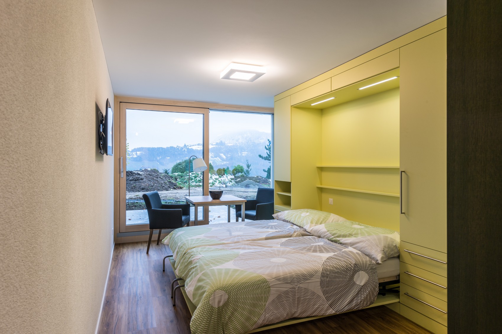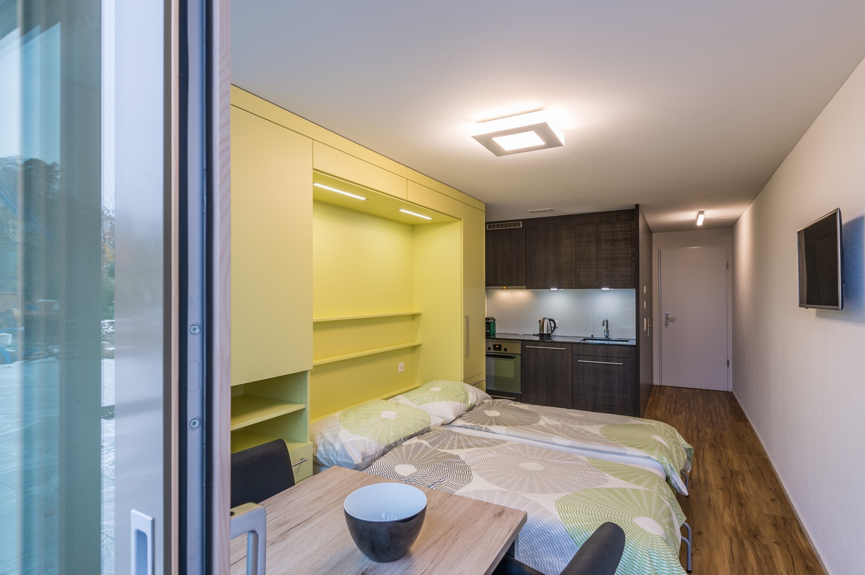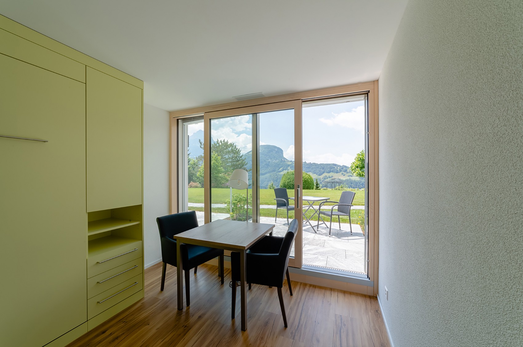 Diese Wohneinheit liegt im Untergeschoss auf der Gartenebene und ist über eine bequeme Treppe oder den Lift erreichbar. Die platzsparenden Schrankbetten können in zwei bequeme Einzelbetten umgewandelt werden. Bei hochgeklappter Version entsteht ein eleganter Wohnraum, in welchem sowohl ein Esstisch wie auch zwei Sessel Platz finden. Der grosszügige WC/Dusch-Bereich sowie die Küchenzeile verleihen diesem Studio die Eigenschaft einer kompletten Wohneinheit.