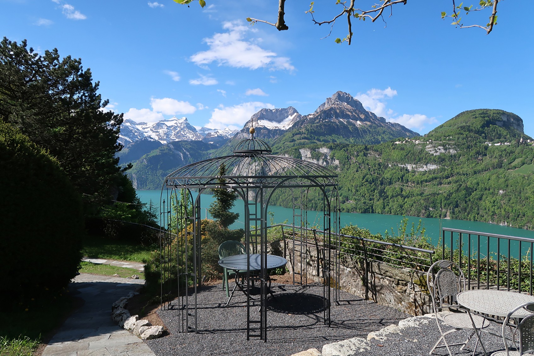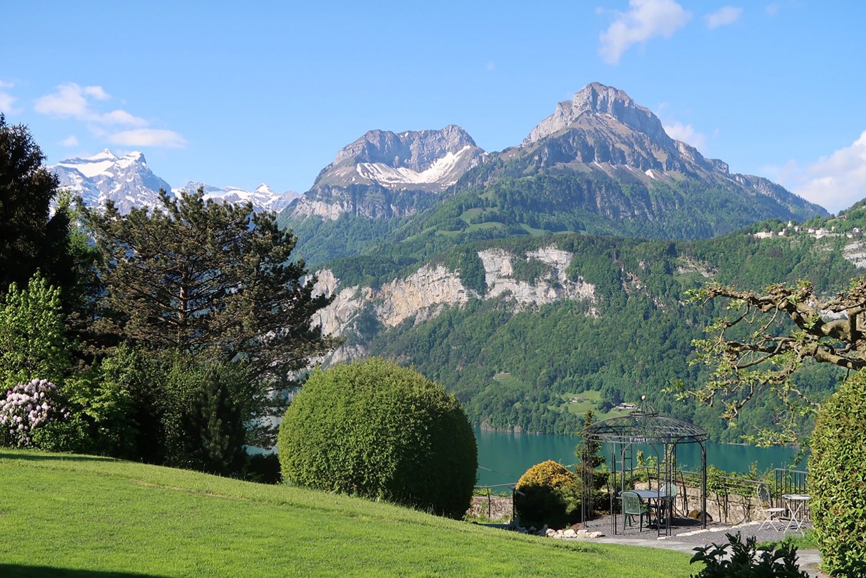 Im Gartengeschoss mit direktem Zugang zum Garten und mit Blick auf die umliegenden Berge befindet sich diese komfortable Studiowohnung. Die gediegene Ausstattung und die elegante Farbgebung sowie die grosse Fensterfront betonen die Originalität dieser Wohneinheiten. Die Einzigartigkeit dieser Wohnung wird unterstützt durch den eigenen Sitzplatz mit direktem Zugang zur Gartenanlage und zur Aussichtsplattform mit grandioser Sicht auf den See und die Berge.