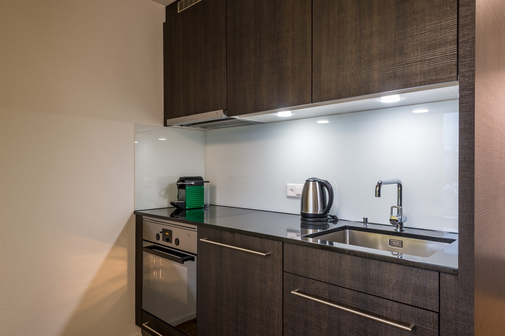 Die elegante Küchenzeile mit dunklen Kunstharzoberflächen und Steinabdeckung verfügt über einen Glaskeramikherd mit zwei Kochfeldern mit Dampfabzug, einen Backofen sowie über einen Kühlschrank mit Eisfach. Ein Mikrowellengerät, Kaffeemaschine, Wasserkocher, Toaster sowie genügend Koch- und Essgeschirr gehören ebenso zur Grundausstattung.