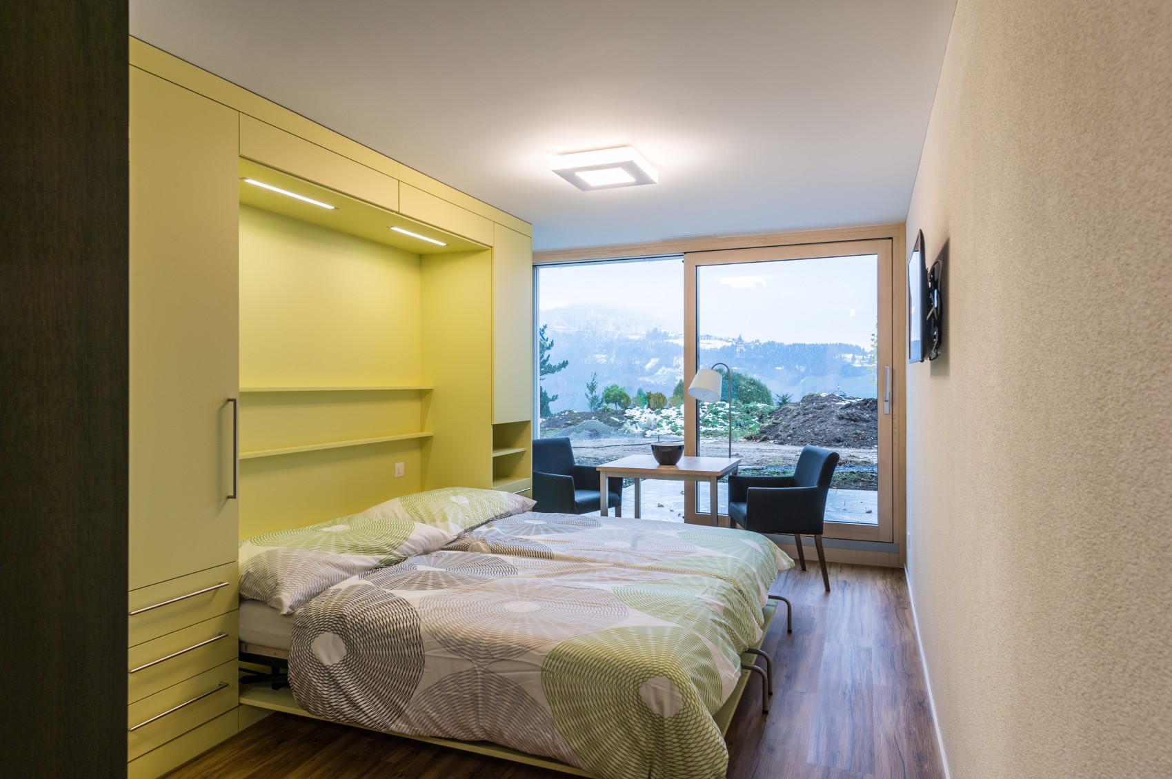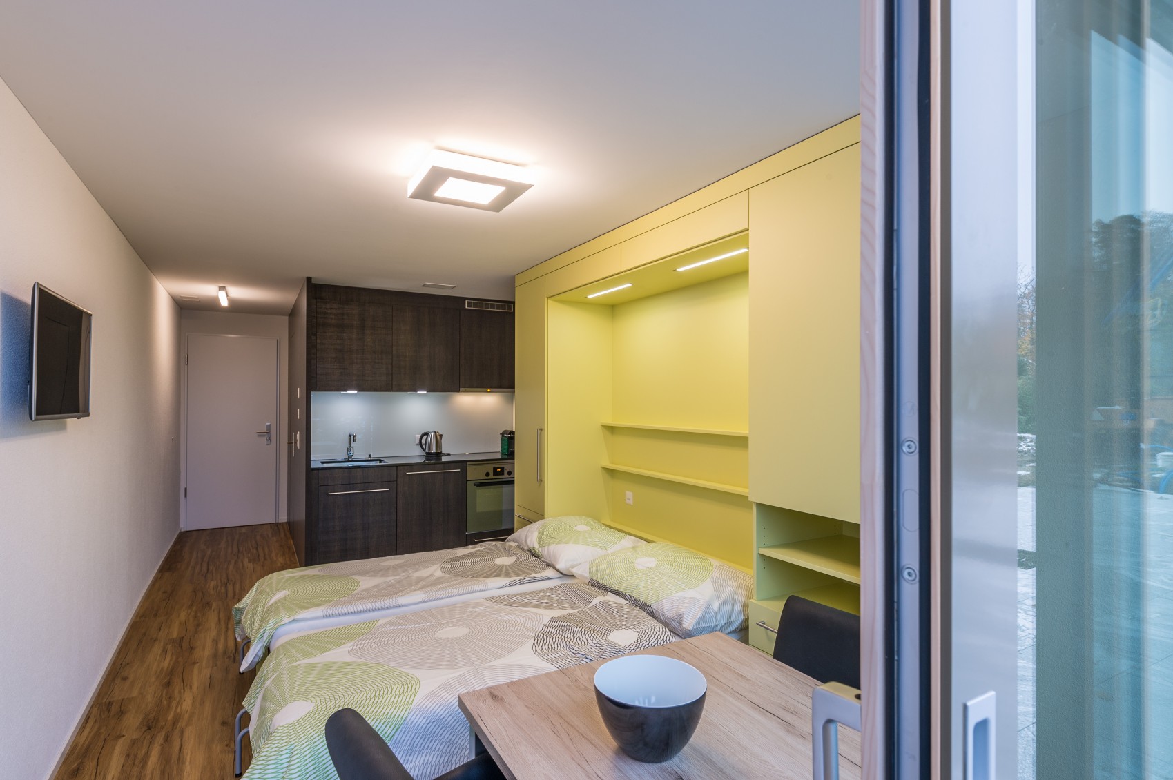 Diese Wohneinheit liegt im Untergeschoss auf der Gartenebene und ist über eine bequeme Treppe oder den Lift erreichbar. Die platzsparenden Schrankbetten können in zwei bequeme Einzelbetten umgewandelt werden. Bei hochgeklappter Version entsteht ein eleganter Wohnraum, in welchem sowohl ein Esstisch wie auch zwei Sessel Platz finden. Der grosszügige WC/Dusch-Bereich sowie die Küchenzeile verleihen diesem Studio die Eigenschaft einer kompletten Wohneinheit.