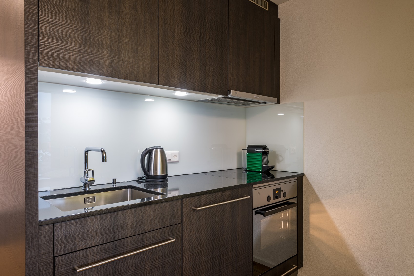 Die elegante Küchenzeile mit dunklen Kunstharzoberflächen und Steinabdeckung verfügt über einen Glaskeramikherd mit zwei Kochfeldern mit Dampfabzug, einen Backofen sowie über einen Kühlschrank mit Eisfach. Ein Mikrowellengerät, Kaffeemaschine, Wasserkocher, Toaster sowie genügend Koch- und Essgeschirr gehören ebenso zur Grundausstattung.