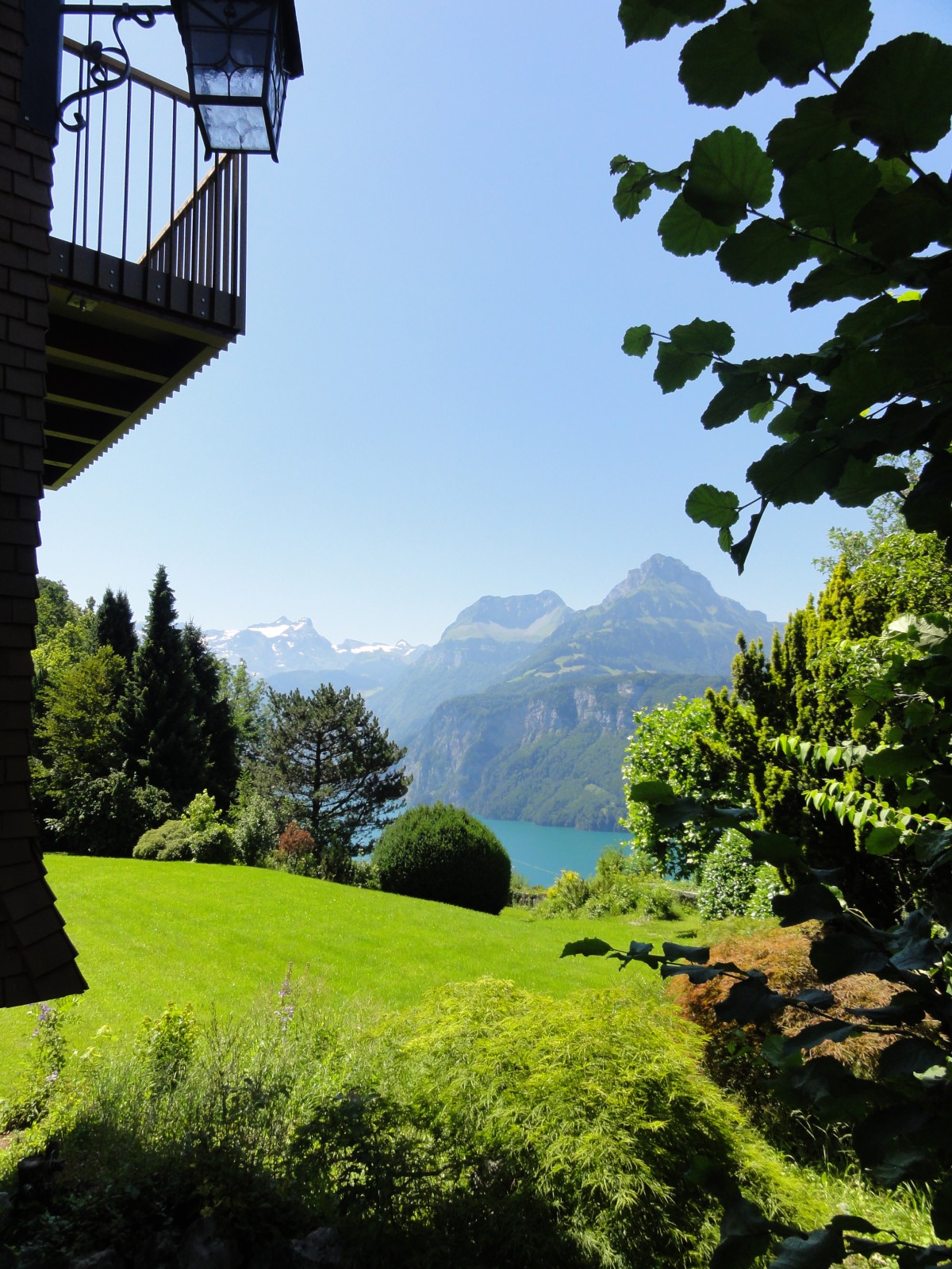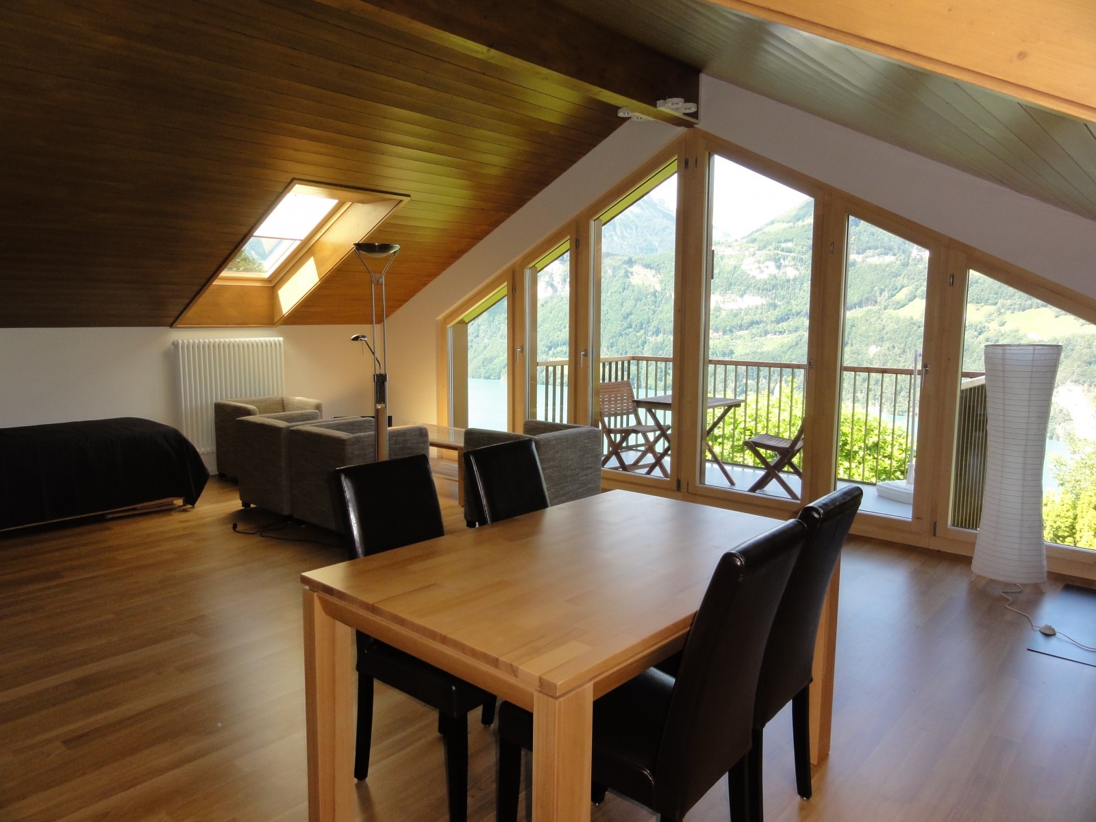 Diese Wohnung, eingebaut in den Seitendachgiebel des Hauses, besticht vor allem durch ihren grossen Wohn- und Essbereich sowie die ausladende Fensterfront zum See hin. Die hellen Eichenparkettböden und die mit dunklem Holz verkleidete Giebeldecke verleihen dieser Wohnung eine vornehme Eleganz. Auf dem geräumigen Balkon lässt es sich vortrefflich den Sonnenuntergang geniessen. Ein moderner Holzofen sorgt im Winter für behagliche Gemütlichkeit.