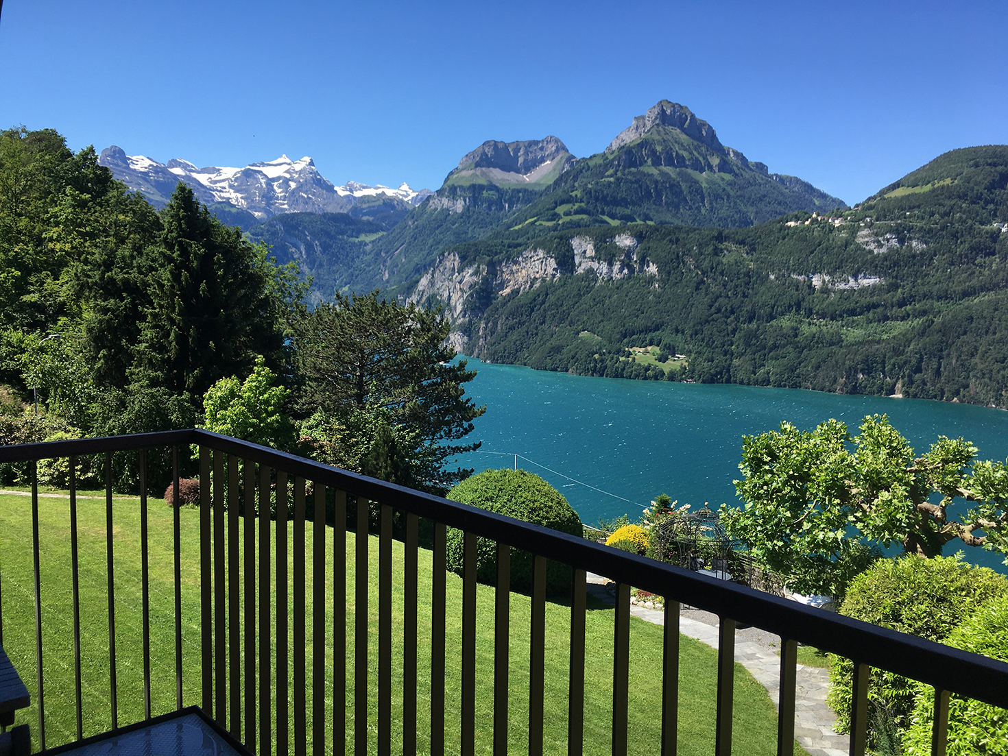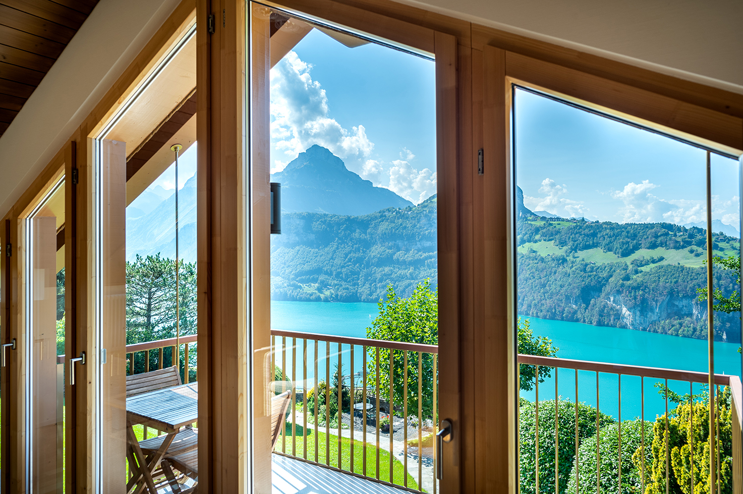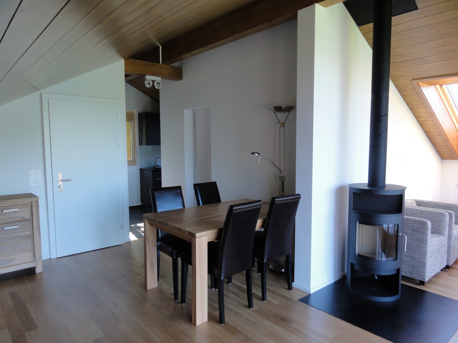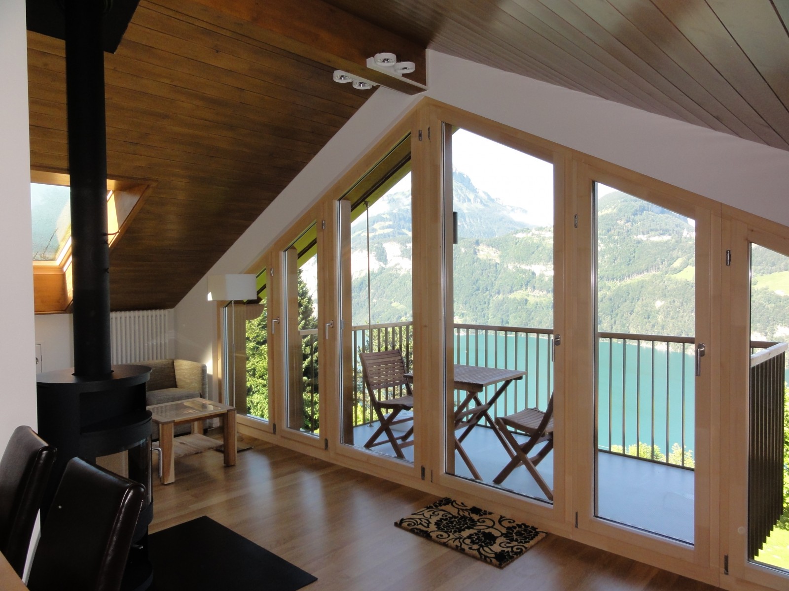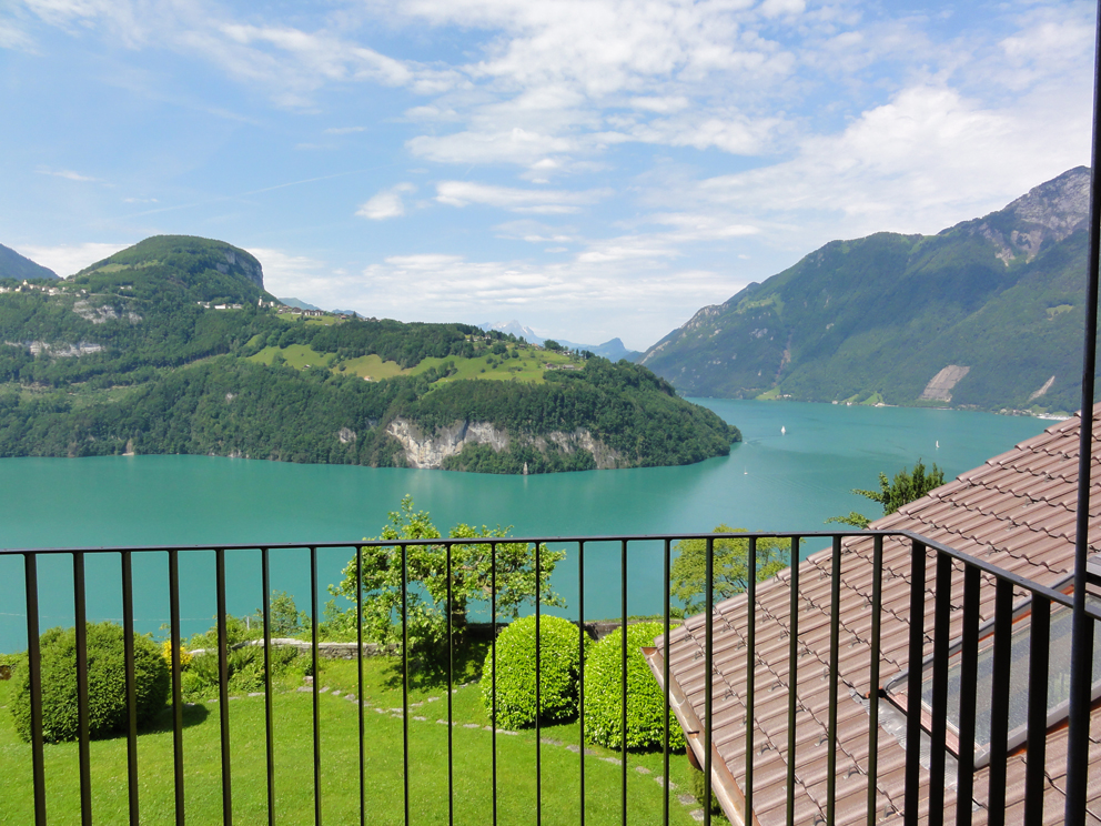 Im ausgebauten Dachstock befindet sich das Schmuckstück des Hauses. Die ausladende Fensterfront und der luftige Balkon lässt Sie direkt über dem Urnersee schweben. Von hier aus geniessen Sie einen unvergleichlichen Blick auf See und Berge. Die verwinkelte Architektur, die hellen Eichenparkettböden, die dunkle Holzgiebeldecke sowie der behagliche Holzofen verleihen dieser Wohnung einen besonderen Scharm.