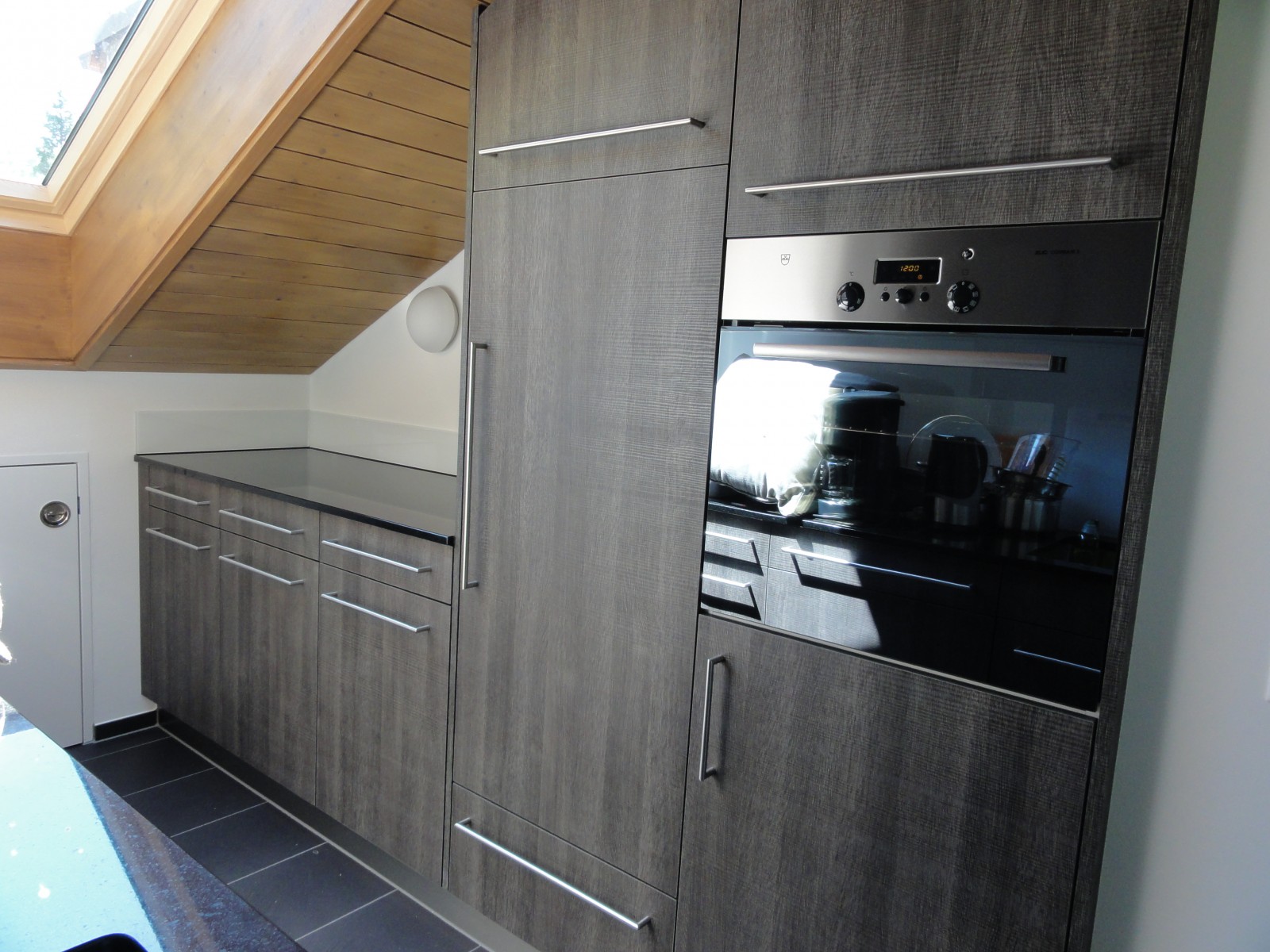 Die moderne Küche mit dunklen Kunstharzoberflächen und Steinabdeckung sowie Fliesenboden verfügt über einen Glaskeramikherd mit vier Kochfeldern, Backofen und Dampfabzug sowie über eine Spülmaschine und einen grossen Kühlschrank mit Eisfach. Ein Mikrowellengerät, Kaffeemaschine, Wasserkocher, Toaster und Mixer sowie genügend Koch- und Essgeschirr gehören ebenso zur Grundausstattung.