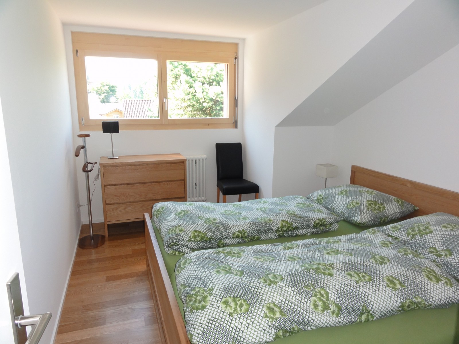Diese Ferienwohnung befindet sich im Dachgeschoss des Hauses, welches über zwei Treppen erreichbar ist und bietet Platz für 2–4 Personen. Bei 4er-Belegung lässt sich der Couche im Wohnraum mühelos in zwei komfortable Einzelbetten umwandeln. Bei Bedarf kann ein separates Zusatzzimmerzimmer im Erdgeschoss mit zwei Betten und eigenem WC/DU hinzugemietet werden.